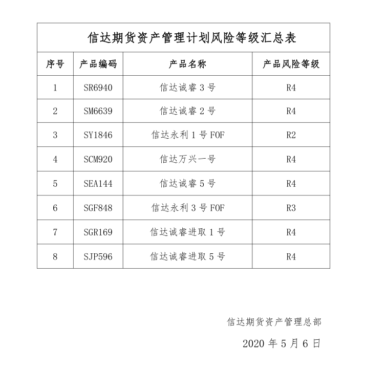 根据《信达期货有限公司投资者适当性管理实施细则》中关于资产管理计划风险等级评定的规定,同时为方便公司资管客户查看公司资管产品的风险等级情况,现将公司管理的集合资产管理计划的风险等级公示如下: