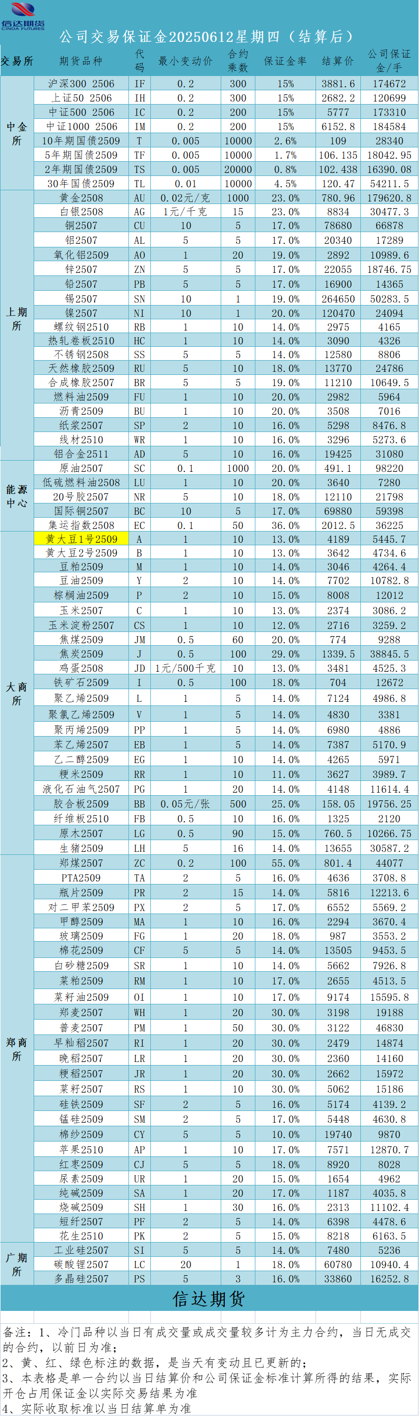 2025年6月12号结算时起期货主力合约公司保证金表【一手要多少钱】