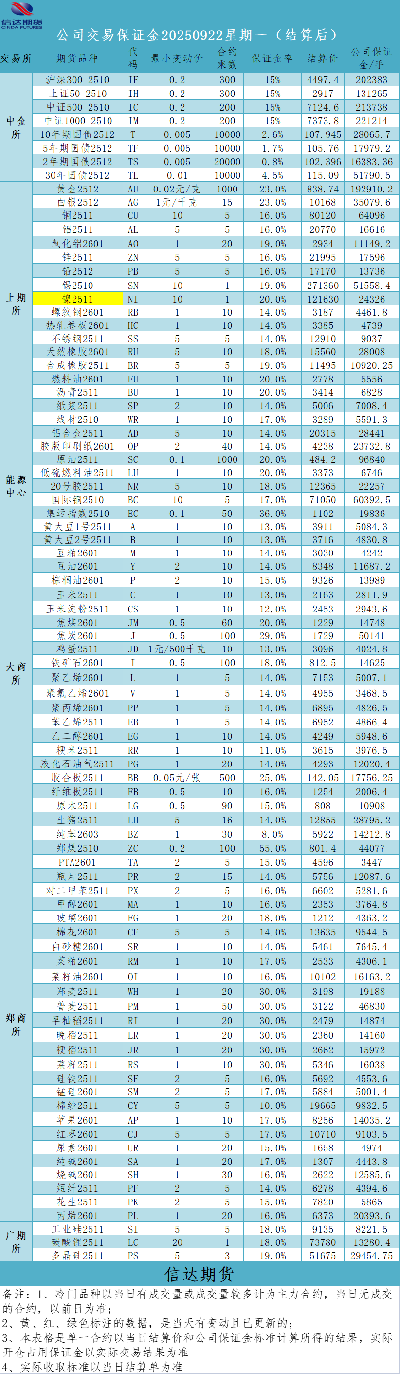 2025年9月20号结算时起期货主力合约公司保证金表【一手要多少钱】