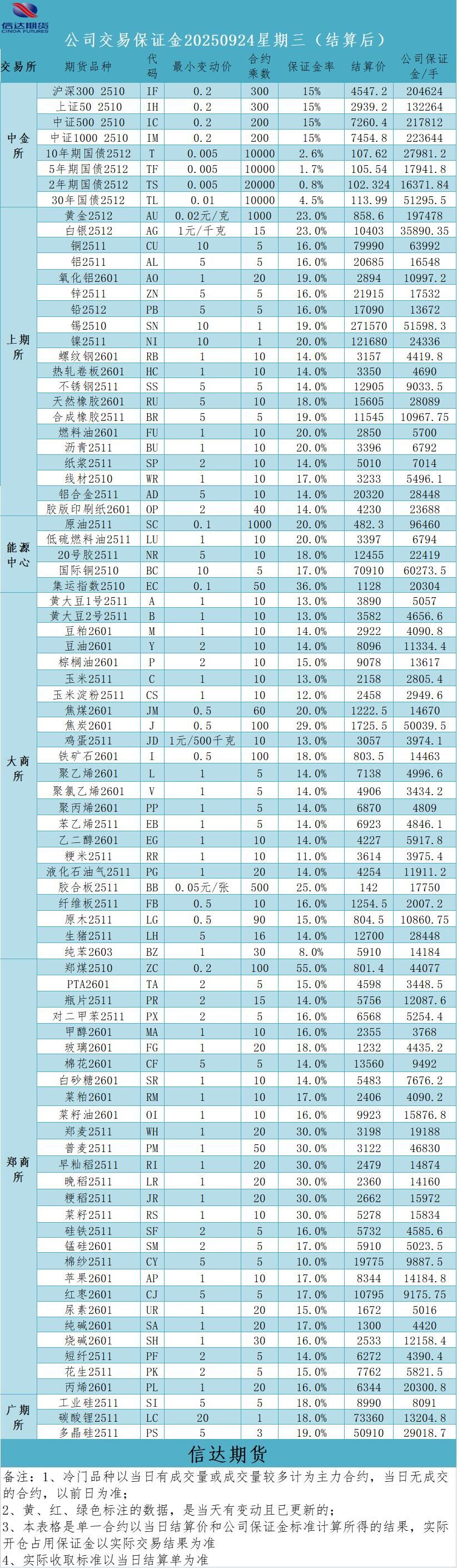 2025年9月24号结算时起期货主力合约公司保证金表【一手要多少钱】